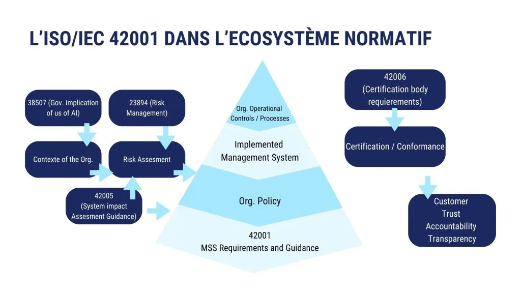 These elements then enable the certification and compliance crucial to establishing trust, accountability and transparency with customers. Other standards, such as ISO 38507, 23894 and 42005, complement ISO 42001. They provide specific guidelines for risk assessment and system impact. In addition, they aim to ensure comprehensive, harmonized AI management within organizations.